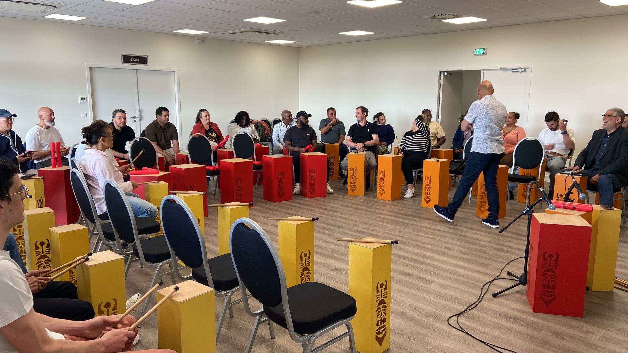 Travaillez sur le challenge des équipes réparties par code couleur (transversalité, admiration, écoute, rire). Cet atelier permet de développer une polyrythmie : chaque équipe joue un rythme complémentaire aux autres pour former un véritable orchestre (renforcer le sens de l’écoute, l'assurance, l’appartenance et la synergie).